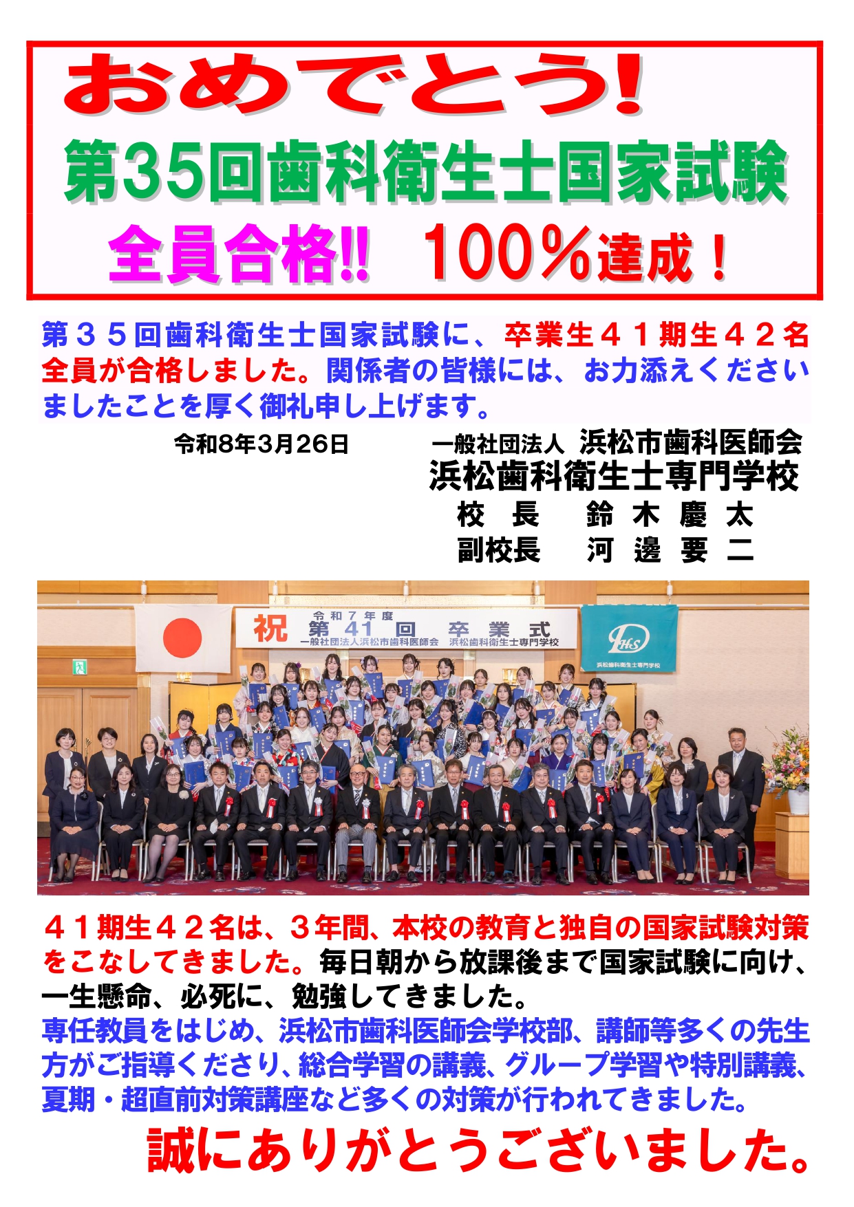 本校では国家試験に向けた綿密な対策と、現場で役立つ実践力を重視した教育により、高い資格合格率を維持しています。また、浜松市歯科医師会をはじめとする地域の医療機関との連携により、毎年安定した就職実績を誇ります。学生一人ひとりの希望に寄り添った手厚いサポートで、自信をもって自分の進路に進める環境が整っています。